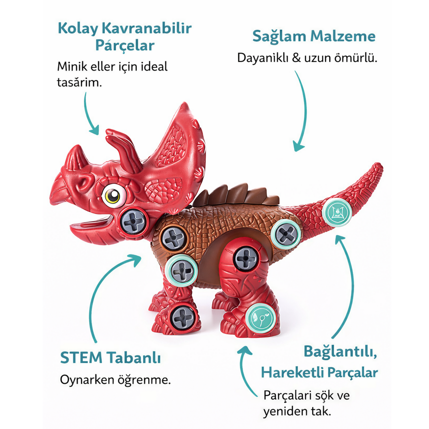Çocuklar, dayanıklı ve kolay kavranabilen parçaları bir araya getirerek kendi dinozorlarını oluşturur. Bu süreç; problem çözme, ince motor becerileri ve erken mühendislik düşüncesinin gelişmesine katkı sağlar.